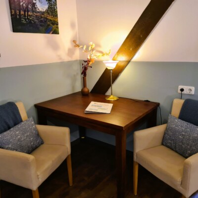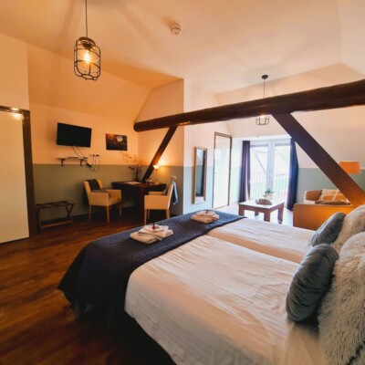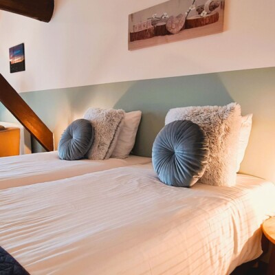 In totaal kunnen er 11 personen over de 4 kamers verdeeld worden, zodat er nog genoeg ruimte overblijft om je even terug te trekken op de kamer. Alle kamers hebben losse bedden. Op 3 kamers staan dan 3 bedden en op 1 kamer staan 2 bedden. Alle kamers hebben een tv, een zitje en een hoge tafel om eventueel aan te werken.
